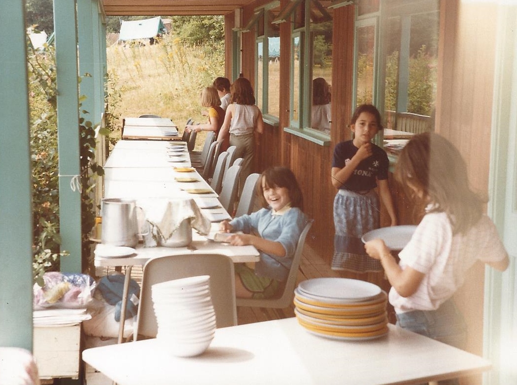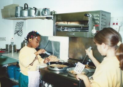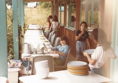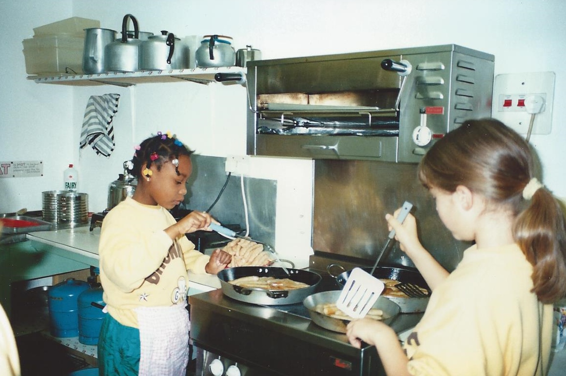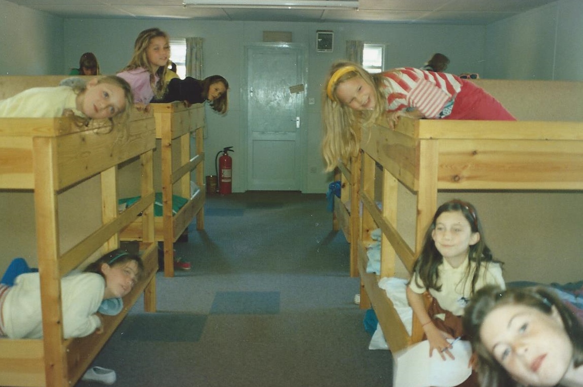 Mrs Faure generously donated the cooker; many other items were funded by generous donations from individuals and units – the fridge (the fridge-freezer was a later addition), various items of games equipment, the rotary drier, almost all the kitchen bowls, basins etc, the original cutlery (which all matched as everyone saved cutlery tokens on Kellogg’s products), the beds for the adults, a number of handmade blankets etc, etc. The decision was made to have melamine plates etc and originally these all matched. The original curtains were made by the mother of one of the Camp Advisers; these have been replaced since, first by some discarded by a local day hospital, and more recently by some made and donated by a Brownie Pack from Balham & Tooting District. Before the dormitory was added the beds for the young to sleep on were ‘safari’ type beds which had to be dismantled or stacked during the day; this added another dimension to the daily chores and limited the usable space in the main room.