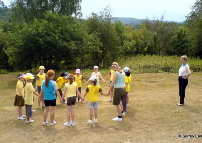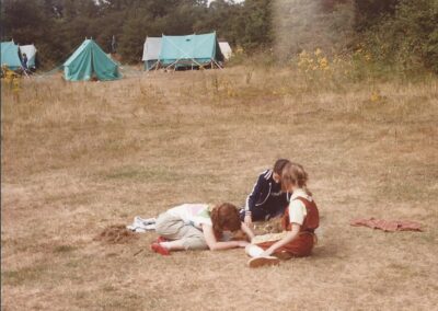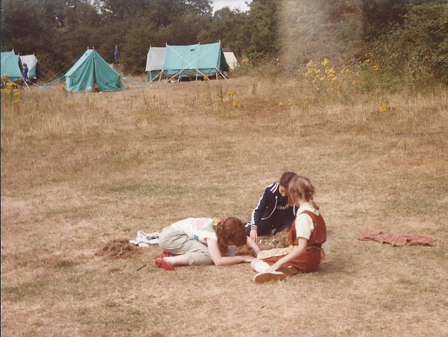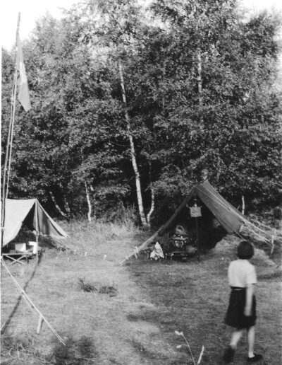 …the field and wood belonged to a Mrs Faure who, at that time, lived in ‘Hacklebarney’, then the only house at the end of Lince Lane, near the footbridge over the River Mole. In the late 1950’s/early 1960’s the West Wandsworth Division of London South West Guides were looking for a campsite. The Division Camp Adviser for West Wandsworth had moved to Abinger and, after an extensive search, arrangements were made with Mrs Faure to rent the area at a ‘peppercorn’ rent of 1 shilling per year (5p in today’s money). There was just one water tap on the field and permission was given for a second tap to be installed further up the field, and for a hut to contain camp equipment to be erected in the wood near the lane. Two men from Westcott already had an allotment each on the left of the small gate allowing access to the site. The allotments were fenced and screened from the road, footpath and campsites. There were two main camping areas – one at the top of the field and the other in front of where the building now stands; also there were two or three small clearings in the woods suitable for Patrols to camp.