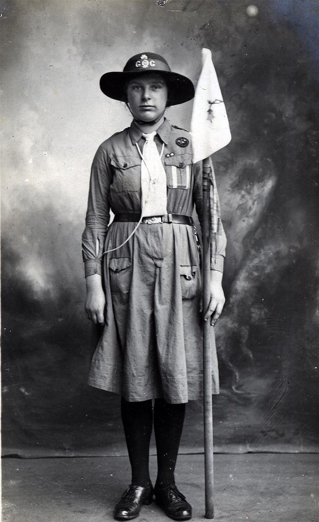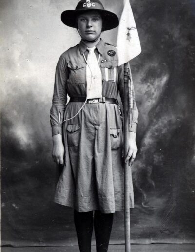 Although we have few records in our archives, we do have two photographs from 1923 – the founding year for 1st Westcott Guides, here pictured in front of a bell tent and Dolly Rose pictured with the unit flag and looking resplendent in her pose and uniform.